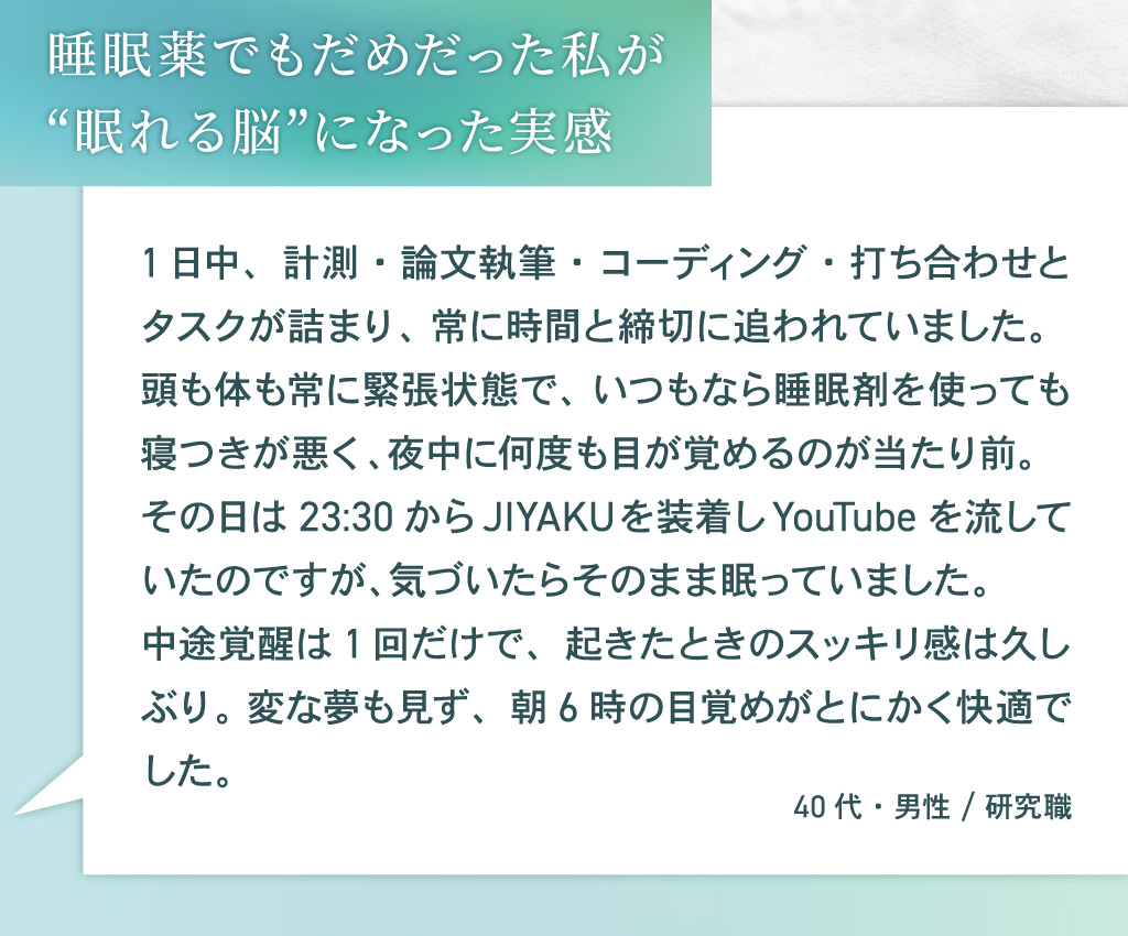 JIYAKUの開発者もまた、かつて重度のうつ症状と不眠に苦しんでいたひとりです。