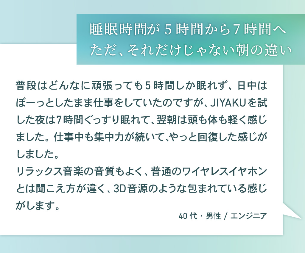 独自の調査とテストで音楽療法の枠を超えた臨床実験により、さらなる効能の向上を目指し、JIYAKUではオリジナルの音響アプリとして開発している。
